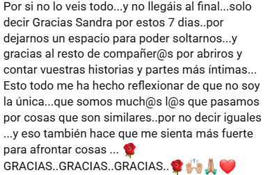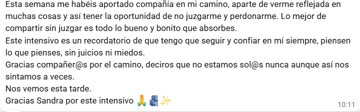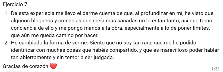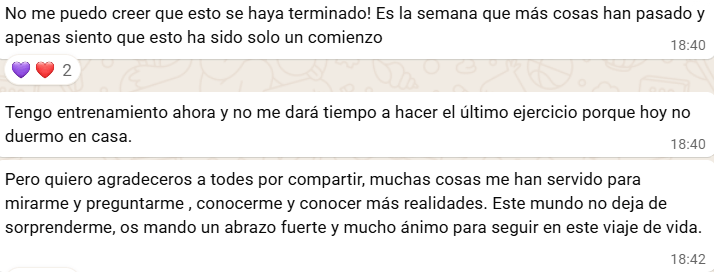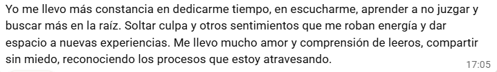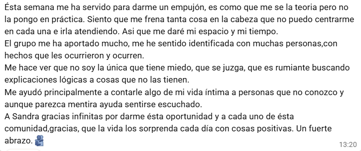 Ya estás experimentando el poder de la comunidad: al compartir en este grupo, sin juicios, te has permitido expresarte y conectar con personas que no conocías, pero que reflejan tu historia y te hacen sentir acompañada.